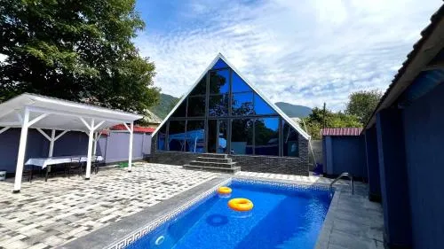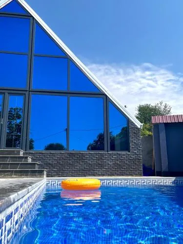Tässä huvilassa on sininen uima-allas, joka tarjoaa visuaalisesti miellyttävän ja virkistävän uintimahdollisuuden vieraille.