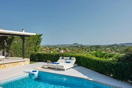 Tässä huvilassa on ulkouima-allas, josta on allasnäkymät terassilta, mikä viittaa yksityiseen uima-altaaseen vieraiden käyttöön.