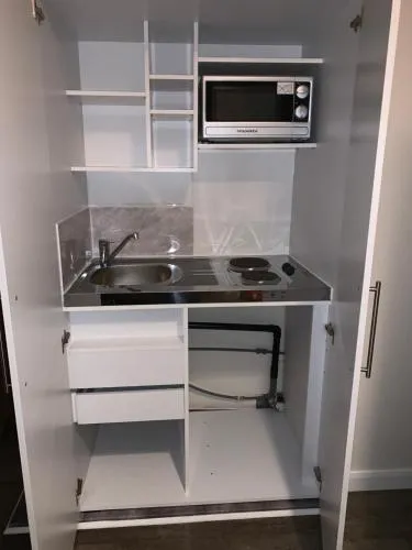 Room with king size bed and shared kitchen